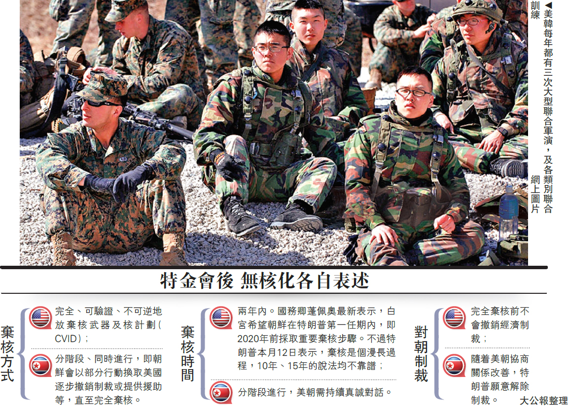 白宫稍晚时分赶紧“稳定军心”,澄清美军只是不和韩军举行大规模军演,正常的战备训练和演习仍会照旧。尽管如此,多家美国媒体,包括深得特朗普信任的霍士新闻台均报道,五角大楼可能会在14日发布声明,宣布有关军演禁令的具体执行方式,确定哪些训练和演习将被暂停,以及将用什么样的代替方案,让驻韩美军保持“充分训练”。消息人士称,届时可能宣布取消8月底的“乙支自由卫士”联合军演。