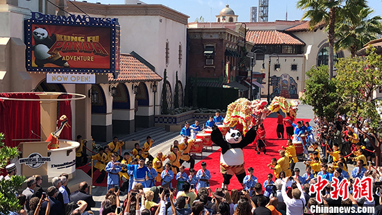 中新社洛杉矶6月14日电 (记者 张朔)当地时间14日上午,随着大明星“阿宝”在一片欢呼声中闪亮登场,美国好莱坞环球影城隆重推出最新游乐项目——“功夫熊猫:帝王任务”。