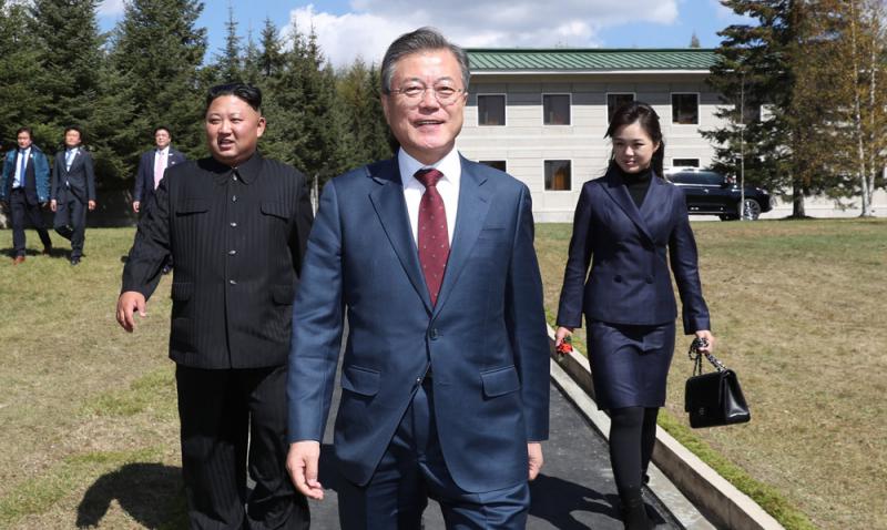 图:18至20日,文在寅(中)与金正恩(左)在平壤举行会晤 资料图片