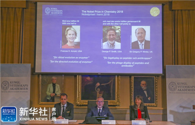新华社斯德哥尔摩10月3日电 瑞典皇家科学院3日宣布,将2018年诺贝尔化学奖授予美国科学家弗朗西丝·阿诺德和乔治·史密斯以及英国科学家格雷戈里·温特,以表彰他们在酶的定向演化以及用于多肽和抗体的噬菌体展示技术方面取得的成果。