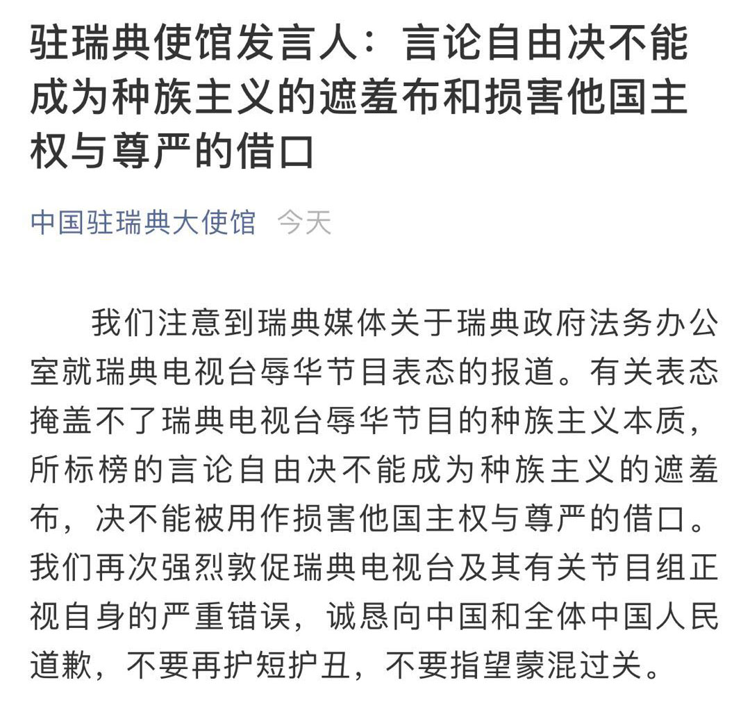14日,中国驻瑞典大使馆微信公众号发布声明称:我们注意到瑞典媒体关于瑞典政府法务办公室就瑞典电视台辱华节目表态的报道。有关表态掩盖不了瑞典电视台辱华节目的种族主义本质,所标榜的言论自由决不能成为种族主义的遮羞布,决不能被用作损害他国主权与尊严的借口。我们再次强烈敦促瑞典电视台及其有关节目组正视自身的严重错误,诚恳向中国和全体中国人民道歉,不要再护短护丑,不要指望蒙混过关。
