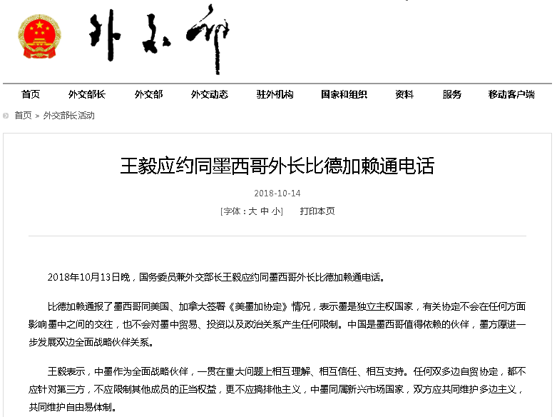 据外交部消息,2018年10月13日晚,国务委员兼外交部长王毅应约同墨西哥外长比德加赖通电话。