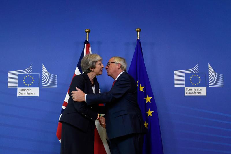 图:欧盟委员会主席容克(右)与英国首相文翠珊17日在布鲁塞尔会面/法新社