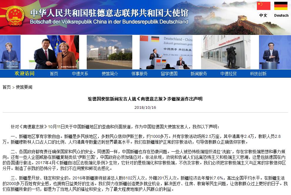 据中国驻德国大使馆网站消息,针对《南德意志报》10月11日关于中国新疆地区的歪曲和负面报道,中国驻德国大使馆发言人近日发表声明称,同德国一样,中国新疆也存在恐袭问题。依法依规,劝说和告诫人们远离恐怖主义和极端主义思潮,这是包括德国在内的各国通行做法。
