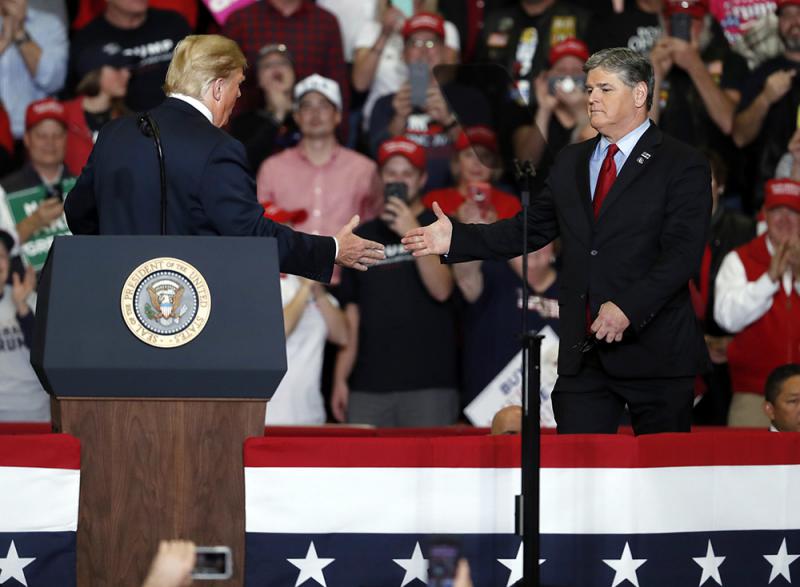 图:霍士新闻当家主持人汉尼蒂(右)5日为特朗普的政治活动站台\美联社