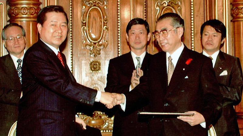 图:1998年,韩国前总统金大中(左二)与时任日本首相小渊惠三(右二)签署《日韩共同宣言》\资料图片