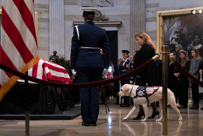 据英国《每日邮报》报道:陪伴美国已故总统老布什生命最后阶段的服务犬“萨利”(Sully)因为守候在主人灵柩旁的照片在网络走红。萨利身穿美国国旗图案的背心,和其他人一起安静、肃穆地待在圆顶大厅向主人致敬,萨利将陪伴布什家族至5日老布什国葬结束,之后牠将重新归队,被转往马里兰州华特里德国家军事医学中心服务。