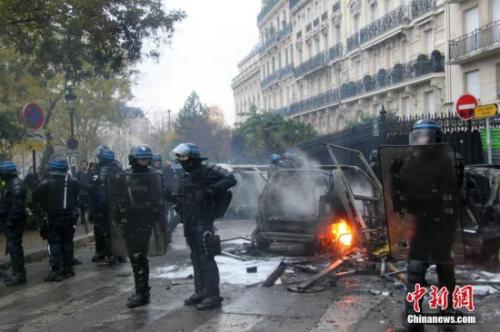 当地时间12月1日,巴黎再次发生大规模示威活动。示威者聚集在凯旋门。大批防暴警察寻求控制巴黎示威造成的混乱局面。图为防暴警察在巴黎市中心正在燃烧的车辆前严密警戒。 中新社记者 李洋 摄