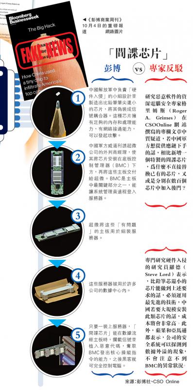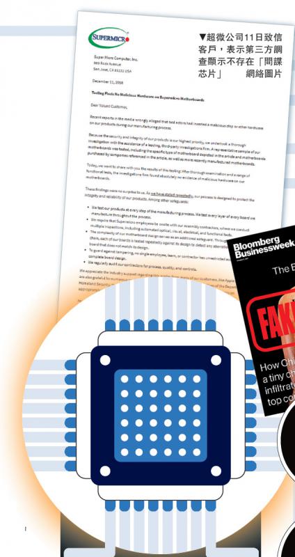 《彭博商业周刊》10月4日发表《超级大黑客:中国如何使用微型芯片渗透美国大公司》的重磅报道,声称中国军方制造出比铅笔笔尖还小的“间谍芯片”,迫使超微公司位於中国内地的外判商经理将其植入主板。这些主板做成的服务器被用於苹果、亚马逊以及多个美国政府机构的数据中心内,声称北京通过这些芯片“后门”获取大量“机密信息”。报道还称,前两家公司早在2015年就配合美国联邦调查局(FBI)调查。