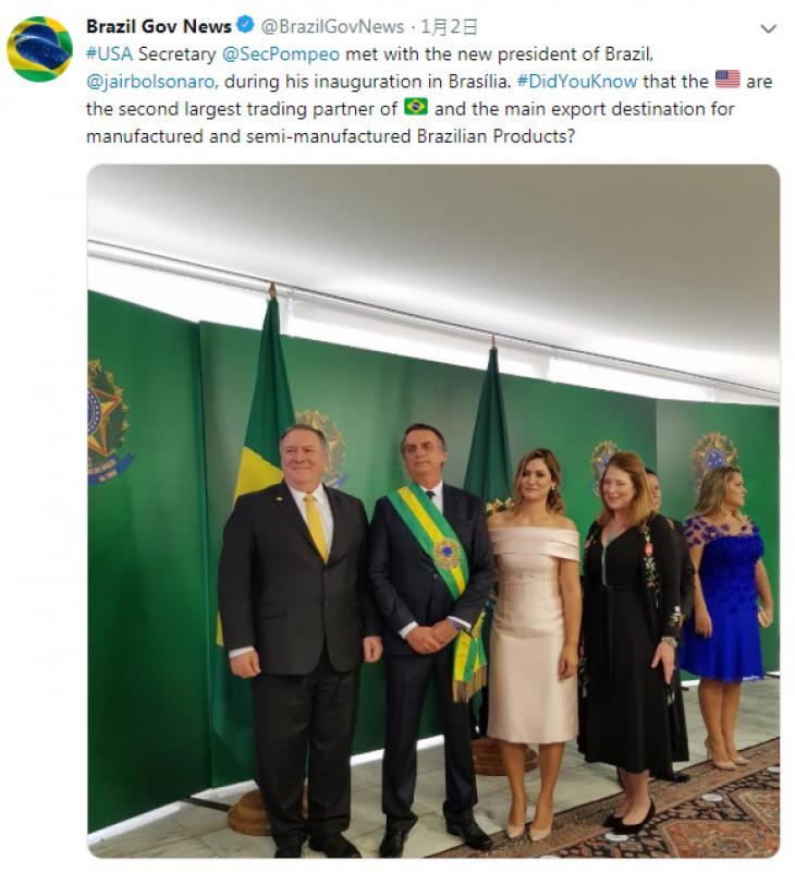 据欧洲新闻台报道:巴西新任总统博索纳罗1日的就职典礼受到多国重要官员捧场,其中包括美国国务卿蓬佩奥。典礼后巴西政府在官方推特盛赞美巴关系,却错将匈牙利总理欧尔班和博索纳罗的合照当做蓬佩奥,被美国方面点名指正十分尴尬。
