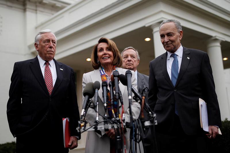 资料图:众院民主党领导人佩洛西(左二)及参院民主党领导人舒默(右一)向记者讲话\路透社