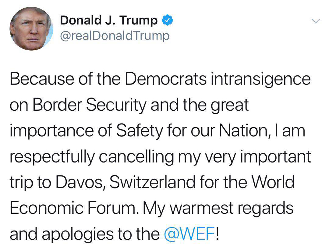 特朗普发布推文表示:“由于民主党人在边境安全问题上拒绝妥协,而安全问题对我国至关重要,我恭敬地取消前往瑞士达沃斯出席世界经济论坛年会的重要行程。”