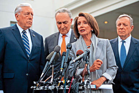 图:众议院议长佩洛西(右二)和参议院民主党领袖舒默(左二)在与特朗普会面后出席记者会\法新社