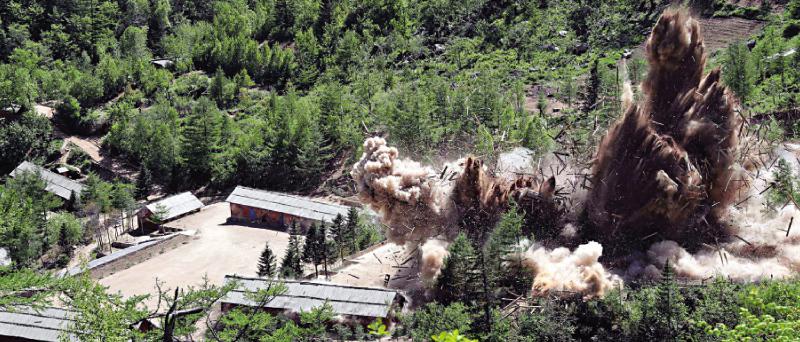图:2018年5月24日,朝鲜爆破丰溪里核试验场的核试坑道及附属设施,正式废弃该核试场。国际记者团获邀见证爆破过程,拍摄历史性一刻 路透社