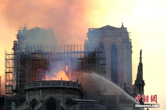 当地时间4月15日晚,法国首都巴黎的著名地标巴黎圣母院发生大火,受损严重。大批消防人员在现场进行扑救。中新社记者 李洋 摄
