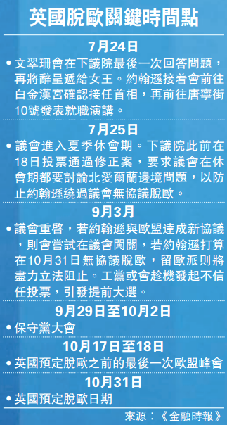 政治观察人士指,约翰逊主张无协议也要脱欧的立场在党内充满争议,难以团结保守党。同时保守党与盟友DUP的联合多数席位正摇摇欲坠,目前仅占3席优势,八月在地区补选中还有可能输给自由民主党1席。他能否避免重蹈覆辙、保住首相之位,关键看他能否闯过三关的考验。