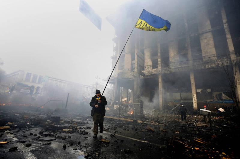 在被称为“最血腥一天”的2014年2月18日,据现场亲历者对记者描述,当时基辅市中心到处是燃烧的轮胎、毁弃的汽车残骸、警察和示威者构筑的临时路障,甚至沾满鲜血的尸体。抗议者向警方投掷石块和汽油弹,警方则回之以催泪弹、水炮及镇暴闪光手榴弹。在随后几天里,甚至有身份不明的第三方枪手同时向示威者及警方开枪,令本已紧绷的紧张态势进一步恶化,警方和示威者都被点燃了。