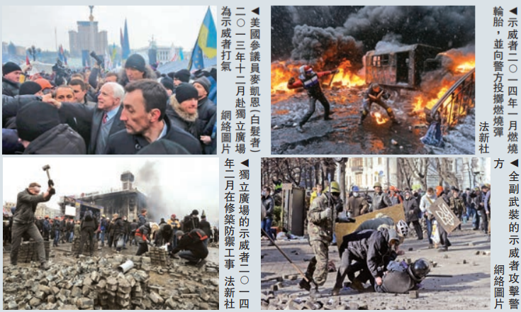 2013年12月15日,美国参议员约翰.麦凯恩和克里斯托弗.墨菲不远万里飞临基辅。在独立广场的舞台上,声嘶力竭的麦凯恩对台下的观众说,他来支持乌克兰人的正义事业,并许诺美国会支持乌克兰融入欧盟一体化进程,“乌克兰将使欧洲变得更好,欧洲也会使乌克兰变得更好”。站在一旁的墨菲不失时机地补充道:“乌克兰的未来在欧洲,美国支持乌克兰作出这一选择……你们正在创造历史!”台下掌声雷动,震耳欲聋。