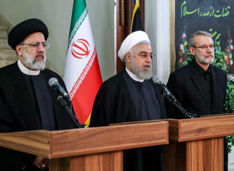 图:伊朗总统鲁哈尼(中)4日发表电视讲话\法新社