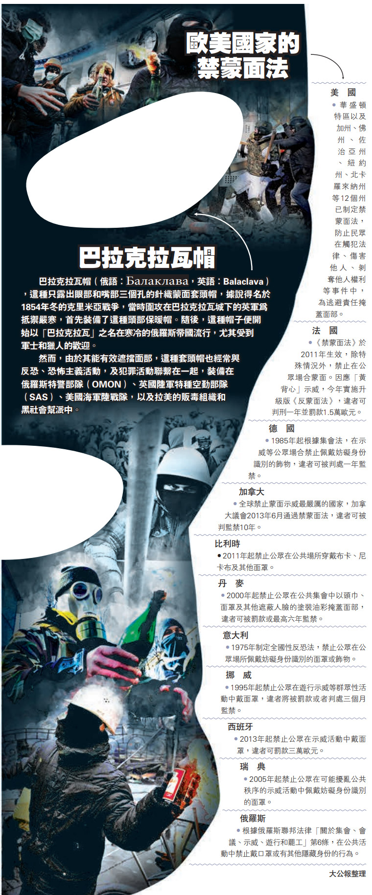 “参加集会,游行,示威等公众活动时,佩戴口罩,头盔或其他面部伪装工具,或使用其他变相手段或方法,以逃避身份或面部识别;参与上述活动的人员燃执明火,烟火(照明类,信号类,模仿类),武器,特殊自卫装置,包括含有催泪或刺激性物质,爆炸性物质或易燃物质,经过特殊改装或预先准备用于实施非法行为的物体等;参加上述活动人员以及未经执法机构允许,穿着或仿着执法人员或军事人员制服者。最低处以一百五十至二百五十格里夫纳的非应税收入罚款,或行政拘留十五天。”\大公报驻乌克兰特约记者 张 浩