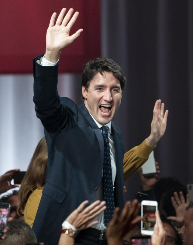 图:加拿大总理特鲁多领导的自由党在21日的选举中胜出\美联社