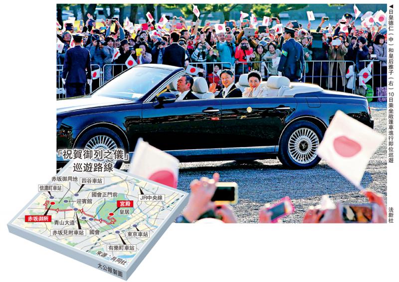 【大公报讯】综合共同社、《日本经济新闻》、NHK及中央社报道:日皇德仁即位游行“祝贺御列之仪”10日下午在东京登场,德仁与皇后雅子乘坐敞篷车,沿着从皇居宫殿至赤坂御所的路线巡游,沿途接受夹道民众祝福。当日有约11.9万民众到现场观看,警方派出约2.6万警力维护周边治安。该仪式原定在10月22日的“即位礼正殿之仪”后举行,但当局考虑到台风“海贝思”的影响决定延期。