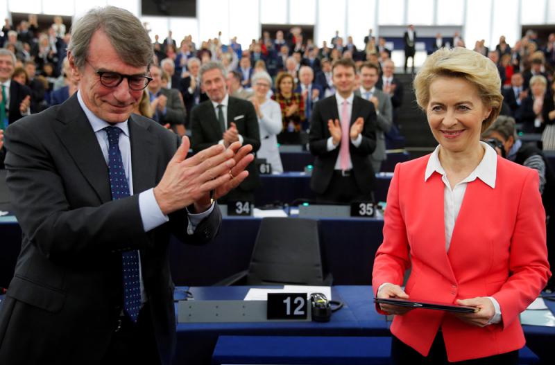 图:欧洲议会27日高票通过欧盟委员会主席冯德莱恩(右)的任命案\路透社