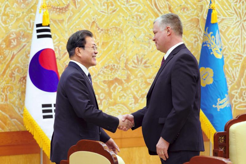 图:韩国总统文在寅(左)16日与美国国务院朝鲜政策特别代表比根会面\法新社