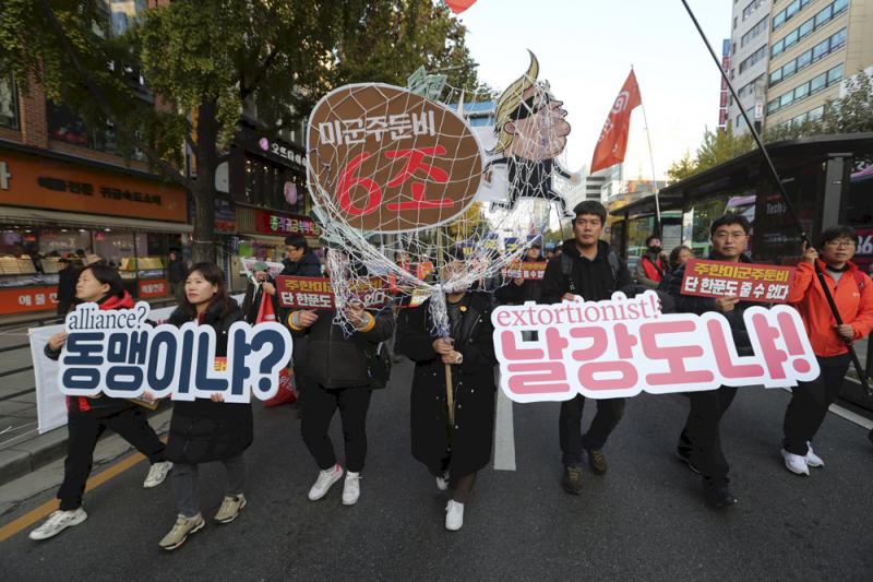 图:首尔民众11月16日抗议美国索取巨额防卫费\网络图片