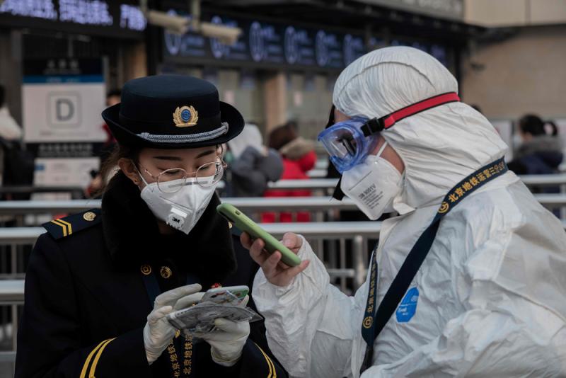 图:身穿防护服的安保人员(右)在北京地铁站与戴口罩的地铁工作人员交谈\法新社