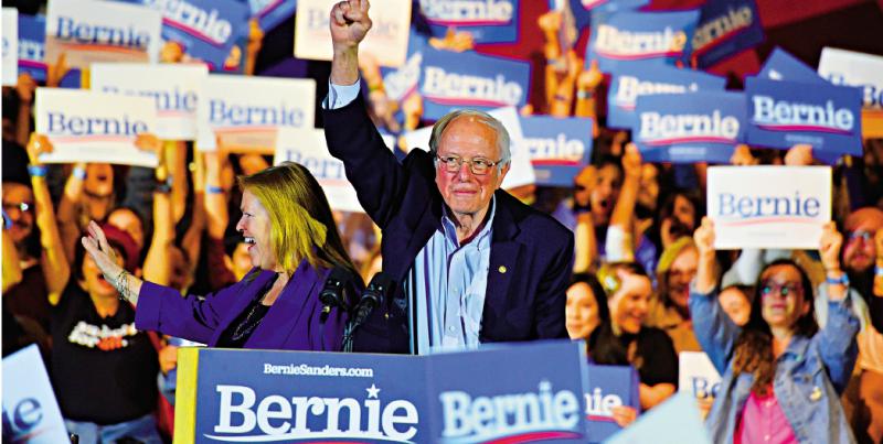图:桑德斯22日在得州的造势活动上庆祝自己在内州胜选\路透社