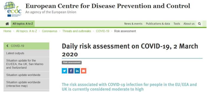 当地时间3月2日,欧洲疾病预防与控制中心宣布,将新冠肺炎病毒的危险程度确定为“中高级”。 图片来源:欧洲疾病预防与控制中心官网。