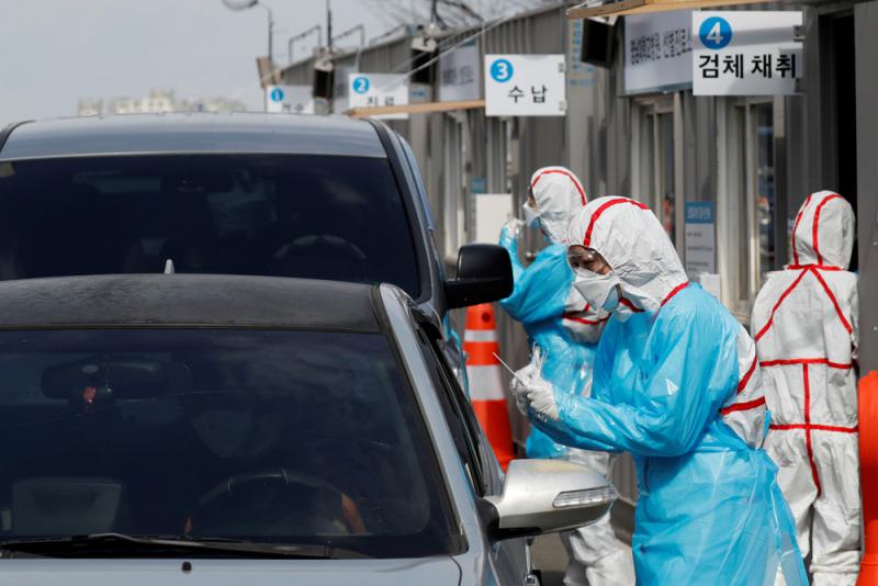 图:医护人员在韩国大邱一个“免下车”检疫点为司机检测\路透社