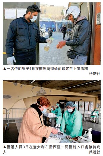 【大公报讯】综合韩联社、路透社、法新社报道:新冠肺炎疫情在全球持续扩散,韩国、伊朗和意大利成为中国境外疫情最为严重的三个国家。三国政府为控制确诊病人人数增长,各出新招投入防疫工作。韩国设置“免下车”检疫点,伊朗暂时释放逾5.4万名囚犯,以防止病毒进一步传播,意大利政府考虑关闭全国学校,并呼吁民众保持距离、避免握手。