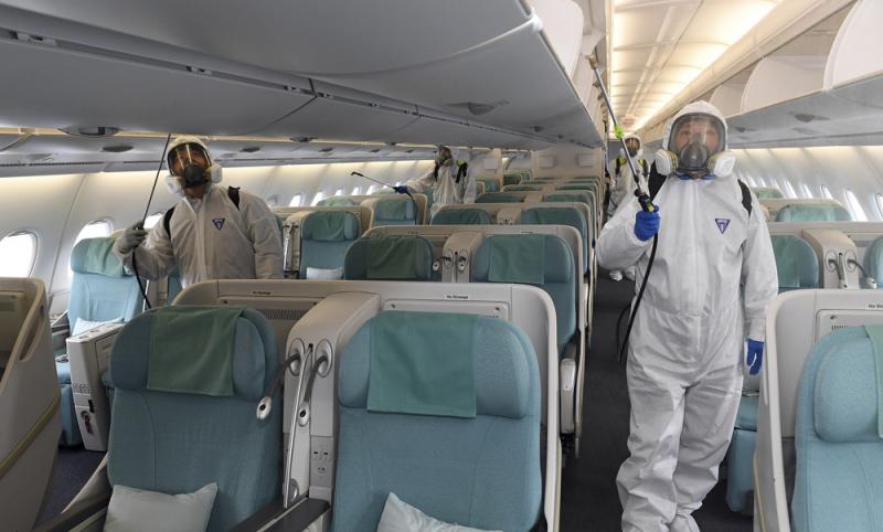 图:韩国检疫人员4日在仁川机场为即将飞往纽约的航班消毒\美联社