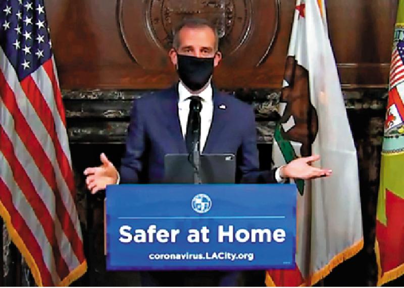 图:洛杉矶市市长加切蒂1日在记者会上戴口罩\网络图片