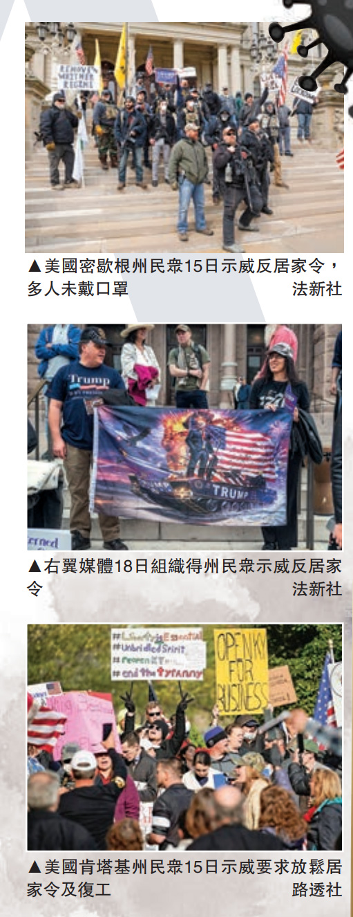 截至20日,美国共有逾76万确诊,逾4万人病亡。该国绝大部分州份自3月中旬以来陆续实施居家令,经济随之停摆,逾2000万个岗位流失。特朗普一直以来急于复工,他虽然16日公布三阶段重启经济计划时,让各州州长决定解封日期,但他同时不停煽动各地不满居家令的民众上街示威。特朗普17日连发推文,声称要“解放”密歇根州、明尼苏达州和弗吉尼亚州民众,19日再次为示威者辩护,称“这些人被关在家中太久,已经出现幽居症……他们想重新回到从前的生活。”特朗普拒绝承认是在煽动暴力,他自豪地说“(示威者)热爱国家,我从来没有看到这么多国旗。”