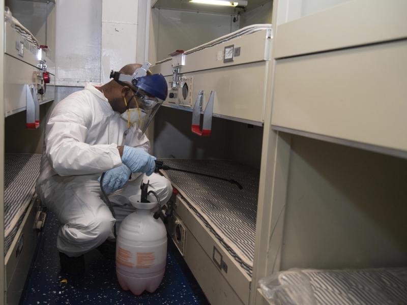 图:美海军士兵12日在“罗斯福号”航母上消毒\美联社
