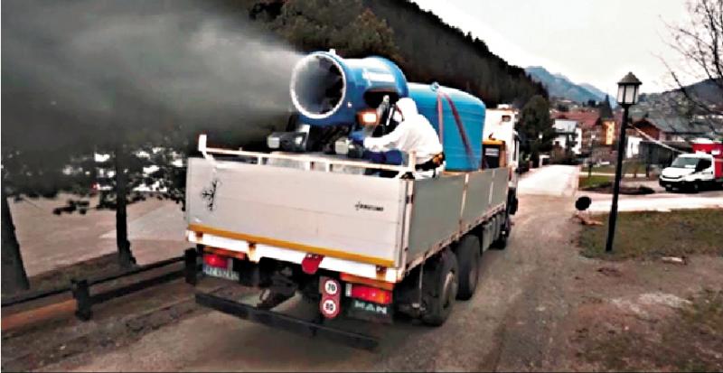 雪炮一般用来为滑雪场铺雪,但在瓦尔加迪纳山谷(Val Gardena),工作人员将消毒剂填入雪炮后将之固定在货车上,驾车对沿途的道路、建筑物等进行消毒。