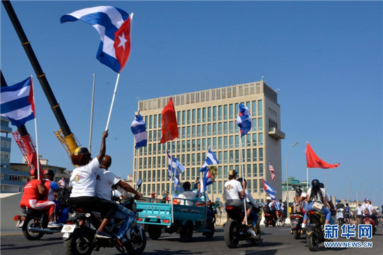 3月28日,参加游行的车队经过位于哈瓦那的美国驻古巴大使馆。新华社记者 朱婉君 摄