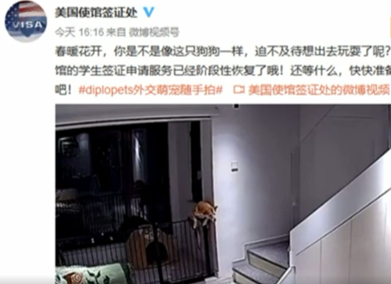美国使馆签证处周三就恢复学生签证申请服务,在微博呼吁学生做好准备并上载片段,片中一只小狗试图翻过围栏,帖文写上“你是不是像这只狗一样,迫不及待想出去玩耍呢?”