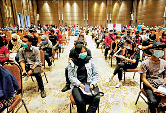 图:印尼民众3月等待接种科兴疫苗。\路透社