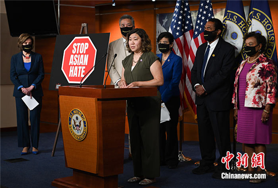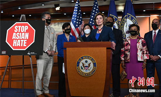 当地时间5月18日,美国众议院民主党人举行记者会,呼吁众议院尽快通过打击反亚裔仇恨犯罪法案。美国会参议院已于4月22日通过相关法案。图为美众议长佩洛西在记者会上讲话。中新社记者 陈孟统 摄