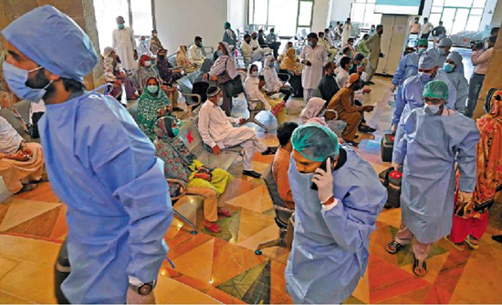 图:巴基斯坦民众19日在接种中心等待接种康希诺疫苗。\法新社