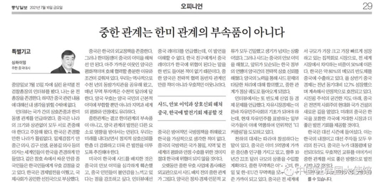 采访谈及国家间的相互尊重,及其与韩美同盟的关系。中国一贯主张,国不分大小,均应相互尊重。韩国无疑是个令人尊敬的国家,即使是在亡国时期,安重根义士、金九先生、尹奉吉义士等的义举也让世界人民对韩国充满敬重。那时中国人民对韩国人民满怀友好感情,双方在同一战壕里共同奋斗。后来韩国经济发展,创造了“汉江奇迹”,现在已成为国际公认的发达国家。中国尊重韩国的外交政策,清楚韩美同盟关系。但韩美同盟不能损害中国的利益。中韩两国近在咫尺,是搬不走的邻居。亲望亲好,邻望邻好。我们有充足的和平相处与互利合作的理由和条件。我们历史上共享几千年的东方价值观,现实中每年贸易投资达到几千亿美元,中韩世代友好不仅符合两国人民的根本利益,也有利于地区和世界和平稳定与繁荣。中韩建交已近30年,中韩关系并非韩美关系的附属品,中韩关系的发展应不受其他因素的影响。我们应该着眼未来,进一步加强政治互信、深化务实合作、增进人文交往,推动双边关系在今后30年不断取得更大发展。