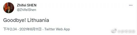中国外交部于8月10日宣布决定召回中国驻立陶宛大使后,8月11日,大使申知非在推特上表示:“再见!立陶宛。”