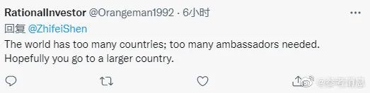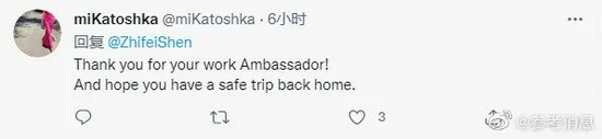 还有一些推特网友表达了对申知非大使的祝福,“感谢大使的工作,希望您平安回家”,“世界上的国家太多了,需要太多的大使。希望您去一个更大的国家”。