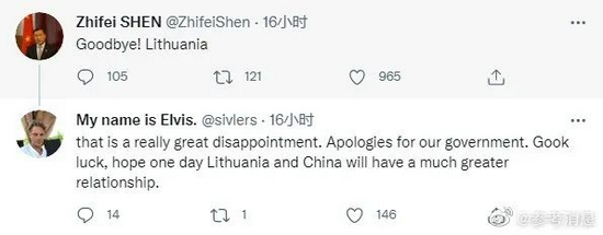 申知非这一推文受到广泛关注,有疑似来自立陶宛的推特网友留言说:“这真是太令人失望了。为我们的政府道歉。祝您好运,希望有一天立陶宛和中国会有更好的关系。”