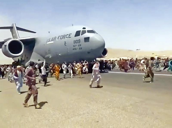 图:数百名阿富汗平民16日围着一架正在跑道滑行的美军C-17运输机奔跑。\美联社
