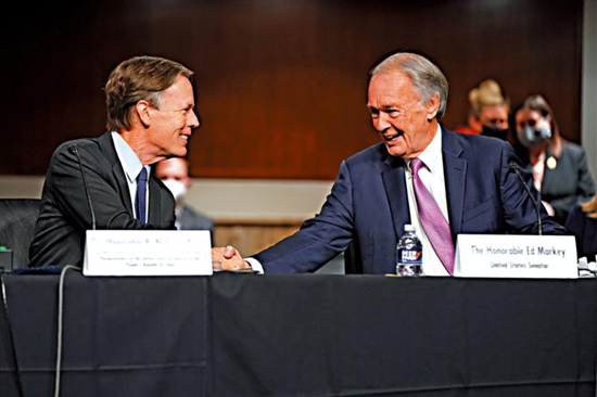 图:美参议员马基(右)20日在参院外交关系委员会听证会上发言支持伯恩斯,并与他握手。\美联社